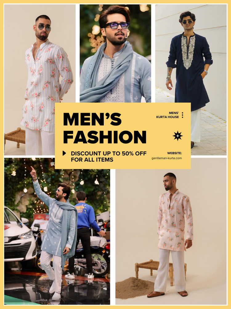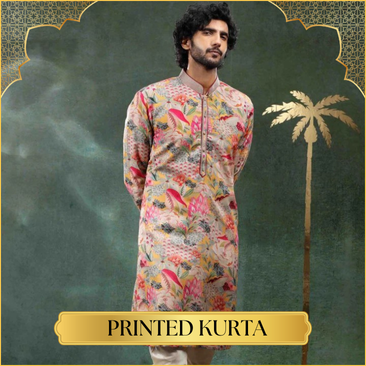 YELLOW AND RED FLOWER PRINTED WORK KURTA PAJAMA SET FOR MEN'S