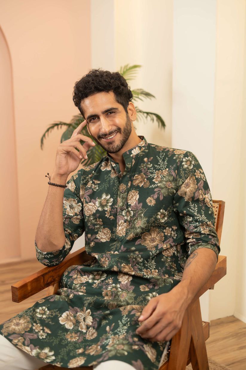 White LUNAR GREEN PRINTED WORK KURTA PAJAMA SET FOR MEN'S This Digital printed Kurta Is Made of 100% Pure Cotton Fabric With Having Hand digital Printed Prints Over It. Our Attractive Prints Add More Charm to Your Look, Wear This at Any Time Because the Fabric Is So Smooth to Skin That You Will Love It.